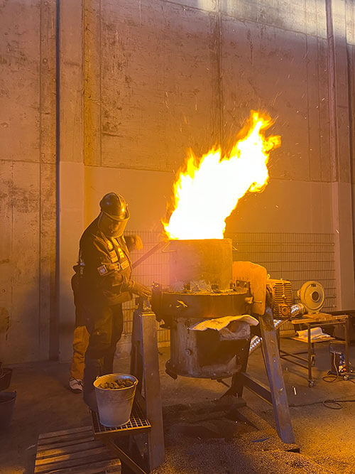 Auf die Minute pünktlich um 12:15 Uhr wird ein mobiler Schmelzofen angefeuert, wir planen die Erzeugung von mindestens einer halben Tonne Gusseisen. Vergossen wird das flüssige Metall in Formen, die zuvor im Museum hergestellt wurden – von Ihnen!
