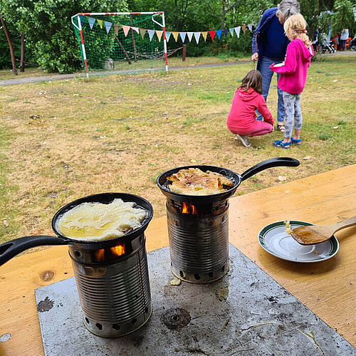 Wenn wir wissen, wie das Feuer ausgeht, können wir uns daran wagen, Werkzeuge zum Feuermachen zu bauen und wie die Steinzeitmenschen ein kleines Lagerfeuer entfachen. Doch auch hier ist das Feuer nur Mittel zum Zweck, es muss gebändigt werden. Wir zwingen die Flammen in selbstgebaute Konservendosenöfen. Diese mobilen Feuerstellen nutzen wir aber nicht nur zum Braten von Spiegeleiern, sondern auch zum Schmelzen von Zinn.
