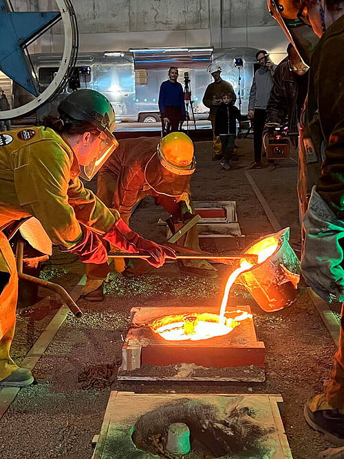 Wenn wir uns auf diese Weise mit den grundlegenden Arbeitstechniken vertraut gemacht haben, können wir uns den großen Maschinen zuwenden. Metallgussexperte und Künstler Hans Molzberger bringt einen rund vier Meter hohen Schmelzofen mit. Dieser Ofen wird so heiß, dass wir damit alte Heizkörper einschmelzen können. Aus dem flüssigen Metall werden wir dann neue Dinge gießen. Die Gussformen stellen wir natürlich selbst her.