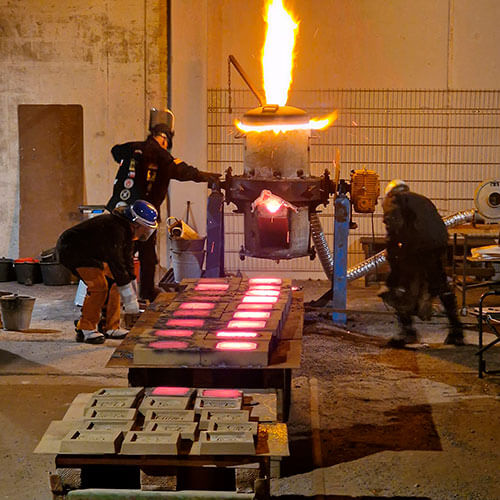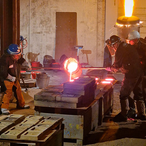 Auf die Minute pünktlich um 12:15 Uhr wird ein mobiler Schmelzofen angefeuert, wir planen die Erzeugung von mindestens einer halben Tonne Gusseisen. Vergossen wird das flüssige Metall in Formen, die zuvor im Museum hergestellt wurden – von Ihnen!